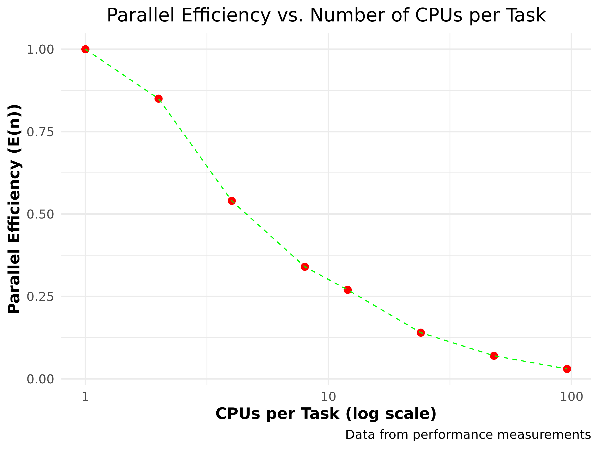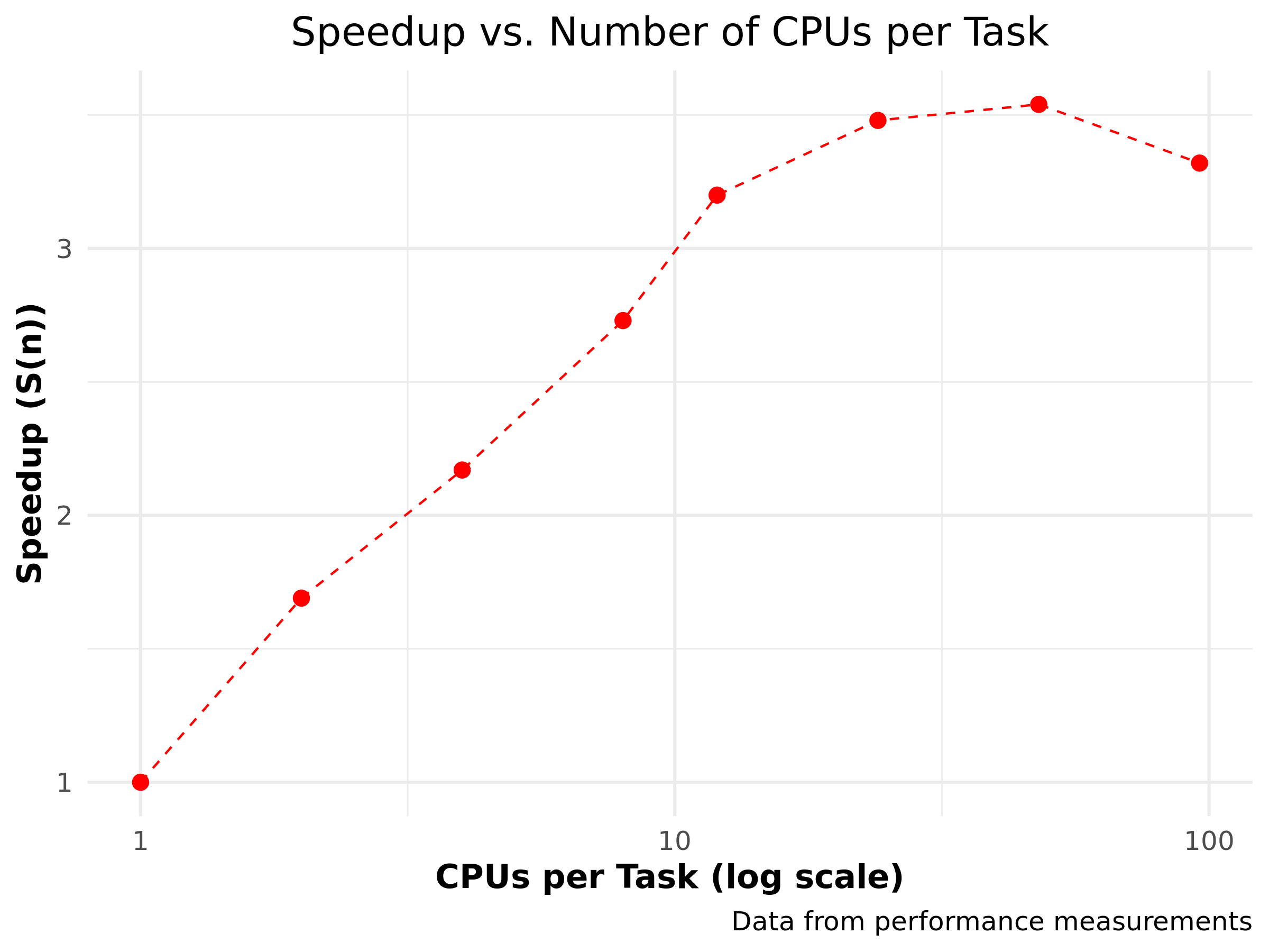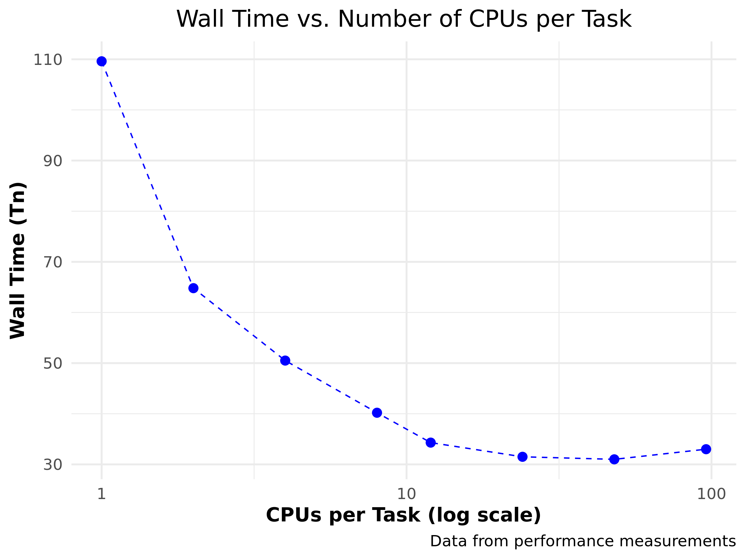 | CPUs per task (\(n\)) | walltime (\(T_n\)) |